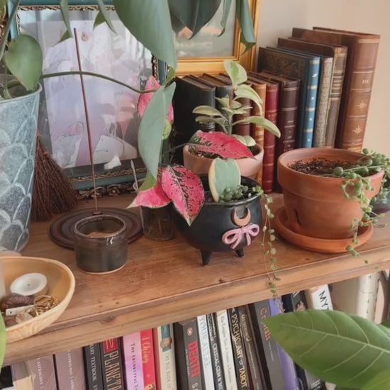 Handmade ceramic stoneware cauldron. Details include feet, handles, moon and star adornments, and patiently sculpted & carved bow.