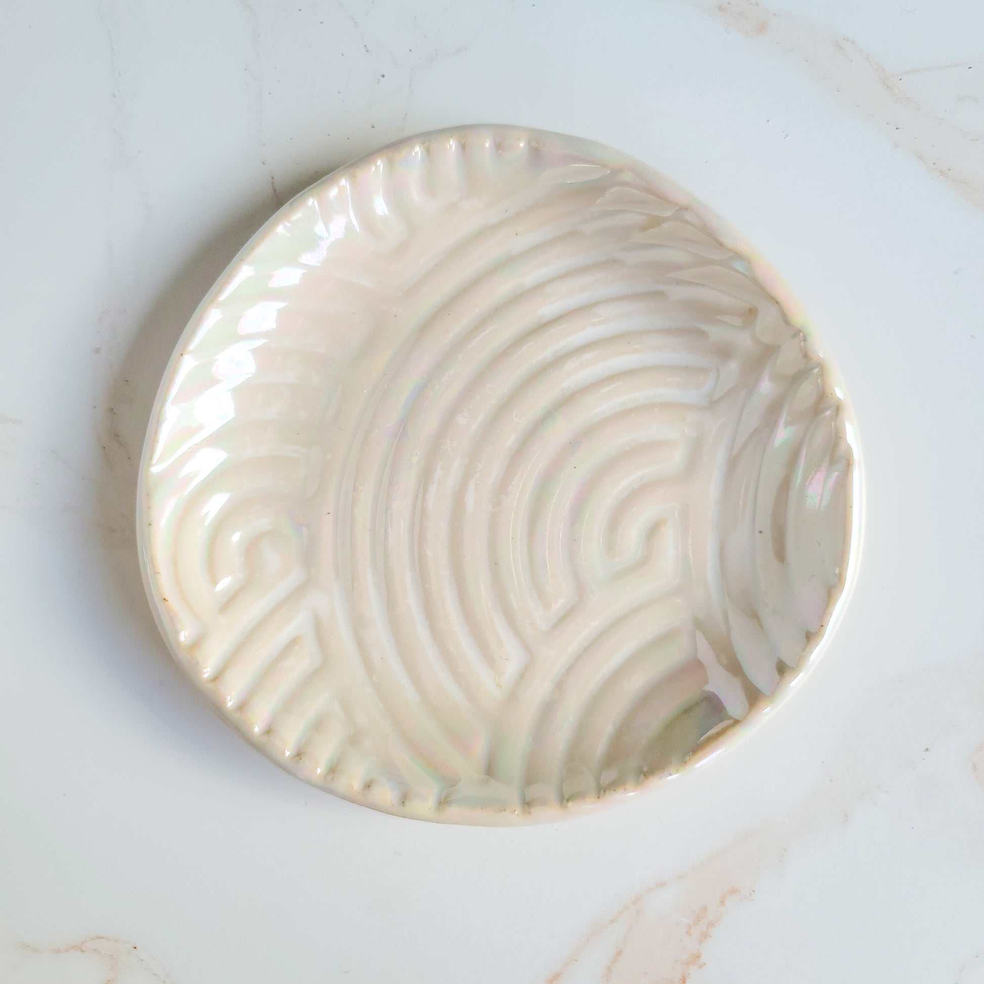 Display jewelry or other trinkets in this textured one-of-a-kind piece. Kiln fired three times, adorned with special mother-of-pearl luster coating.